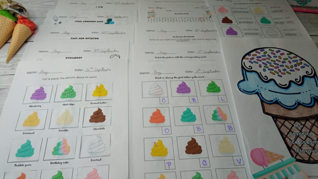 Ice Cream Theme Preschool – Literacy Centers Kindergarten – Word Work Stations – ESL / EFL Vocabulary Practice – Sub Plans