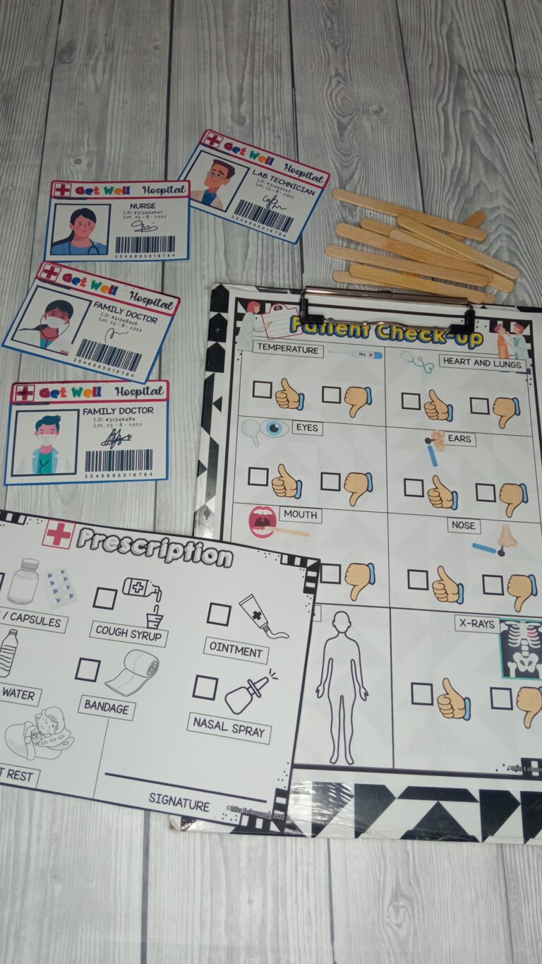 I add posters, patient forms, and simple props. Then students choose roles like doctor, nurse, receptionist, or patient. The amazing thing about dramatic play is that students begin using the vocabulary naturally, even if the sentences are simple. One student might say: